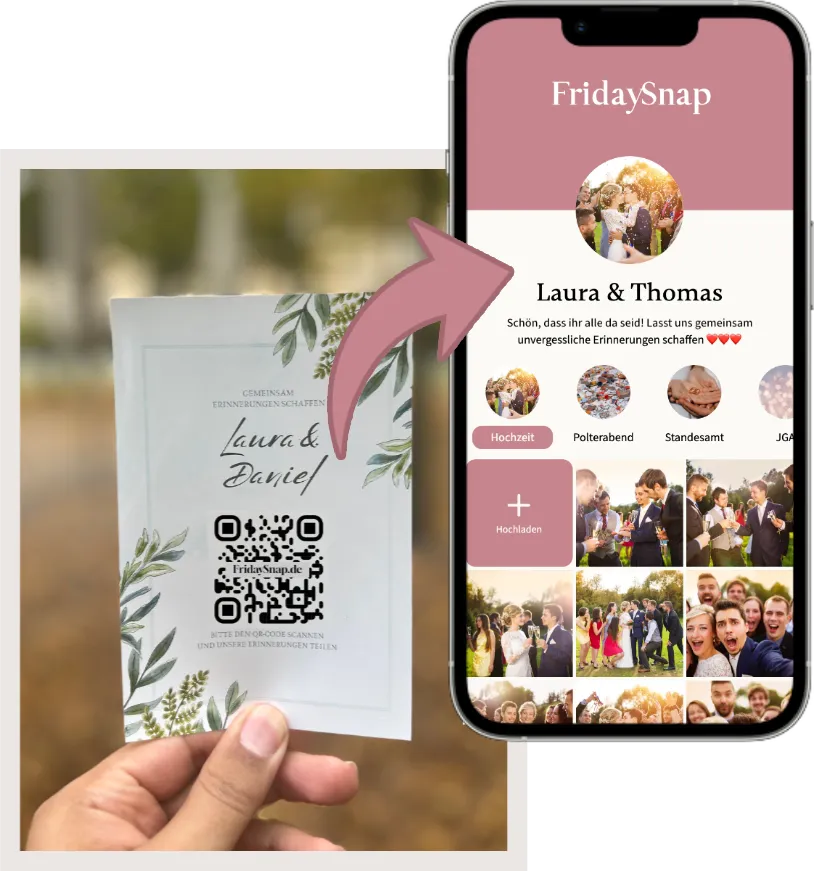 Stelle deinen personalisierten QR-Code bereit, damit Gäste ihre Fotos und Videos teilen können.
